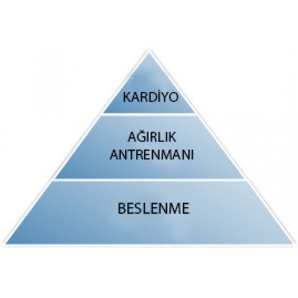 Piramid diyagramda gösterildiği gibi vücut geliştirmede 3 temel vardır. Beslenme bu piramidin temelini oluşturmaktadır, eski bir söz vardır "Ne yersen O'sun" eğer beslenme kalitesizse sağlıkta bozulur, vücut yapmakta zorlaşır. Beslenmeden sonra Ağırlık antrenmanı gelir, Ağırlık antrenmanı kardiyodan daha önemlidir çünkü, ağırlık antrenmanı yaptığımızda kas kütlemiz artar, artan kas kütlesi daha çok enerjiye(kaloriye) ihtiyaç duyar, buda aldığımız besinlerin maximum verimle absorbe edilmesini kasların büyümesini sağlar, böylece yağ depolanmaz. Piramitin en tepesinde yer alan kardio, kalp sağlığı ve dayanıklılığı artırmak için çok faydalıdır, kalori yakmak için tercih edilir.